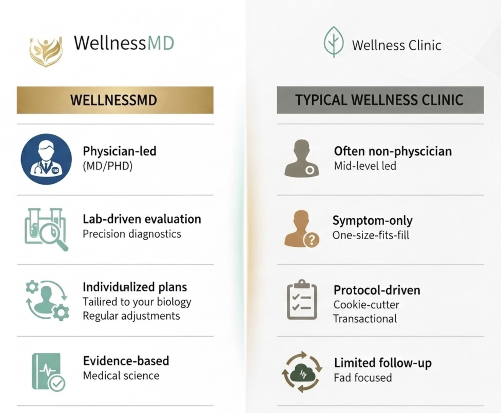 Real medical care, not a wellness trend. Hormone and metabolic therapies require expert risk assessment, cardiovascular consideration, and conservative dosing. At WellnessMD, your care is overseen directly by a physician with advanced clinical and surgical training to ensure safety and precision.
